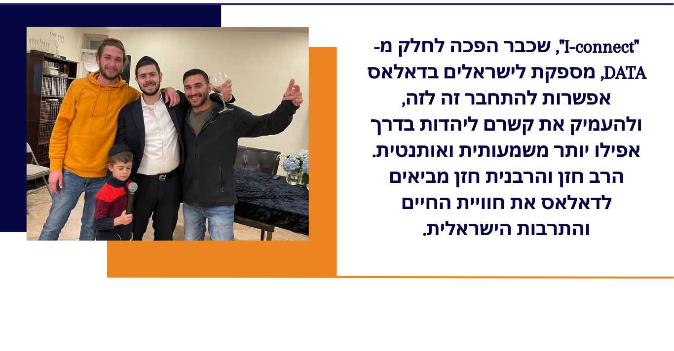 I-Connect, a division of DATA, provides Israelis in Dallas the opportunity to connect with each other, while deepening their connection to Judaism in a meaningful and authentic way. Rabbi and Rebbetzin Chazan bring the experience of Israeli life and culture to DFW.